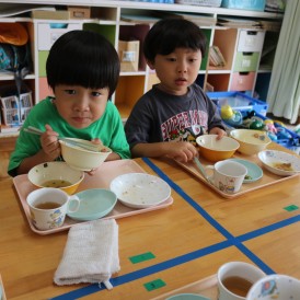 給食やおやつを食べる時、スプーンを上手に使って食べています!!