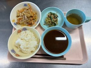 ごはん 豚肉のじゃが芋きんぴら みそ汁 おかかあえ