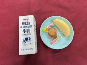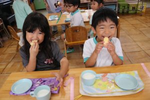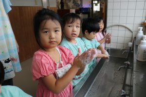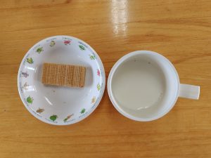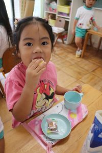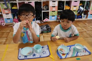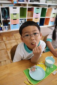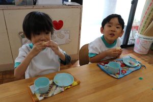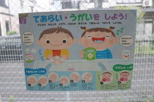 おやつ前は窓に貼ってあるポスターを見てマネっこ!