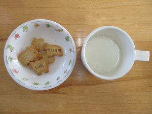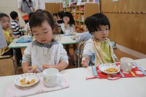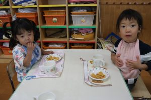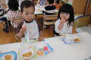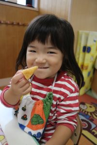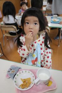 今日のおやつはとんがりコーン!指にさして、帽子😆と見せてくれる子も。