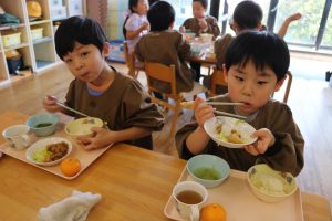ごはん 油淋鶏 チンゲンサイスープ みかん