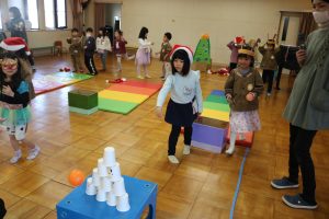 紙コップで作ったスノーマンをボールで崩すゲームとプレゼント積み🎁・・・最後はツリーの飾りつけ✨