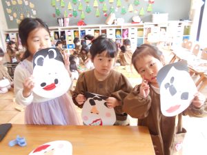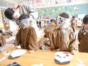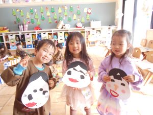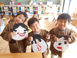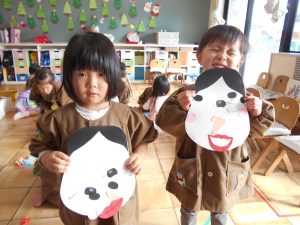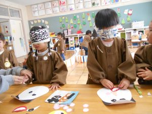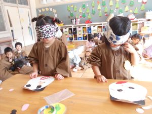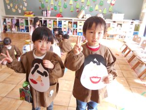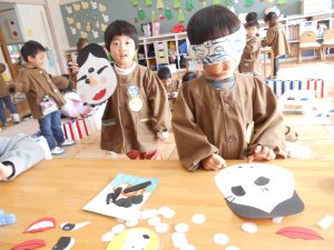 初めに福笑いのルールを説明すると、「えー見えないじゃん!」「難しいよ~!」と言う声もありましたが、実際にやってみると楽しそうでした♪