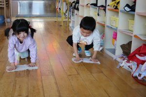 年中さんは、憧れの年長さんの真似をしてお掃除の雑巾がけ✨