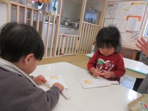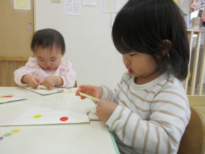 上手に台紙からシールを剥がして「ペタペタ」と言いながら貼っている子もいました。