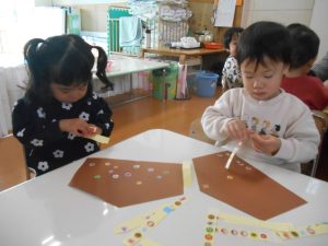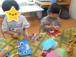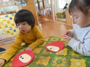 でもでも、保育者の見本を見ながら「目は~」「口ここ~」などお話を沢山しながら楽しむみんなでした。