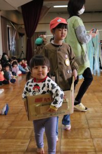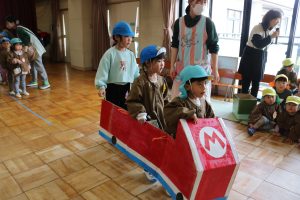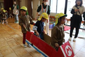 年長児と一緒に段ボールで作った電車に乗ってガタンゴトン・・・ガタンゴトン・・・