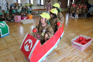 ・初めに車に乗って玉入れの玉を取りに行きます。みんなが玉を持ったら玉入れ開始!!全部の玉を箱の中に入れられたら勝ち!!