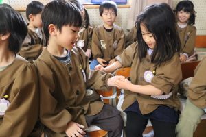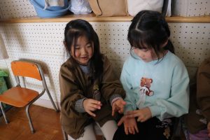 食べ終わるとみんなで、指相撲をしたり、影絵の形を手で表現する遊びを楽しんでいる子どもたちです😊