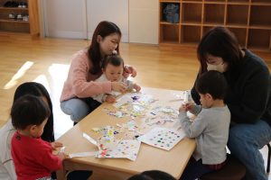 コマと凧にシール貼りをしたり、絵を描いたり・・・