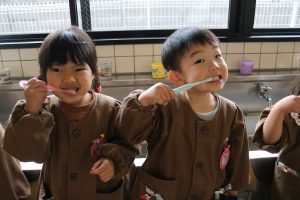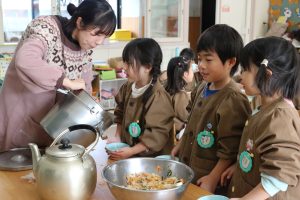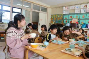 先生や友だちと楽しく会話して給食の時間を楽しんでいるみんな。