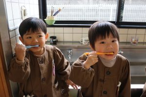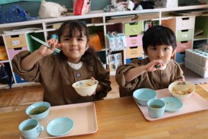 先生や友だちと楽しく会話して給食の時間を楽しんでいるみんな。