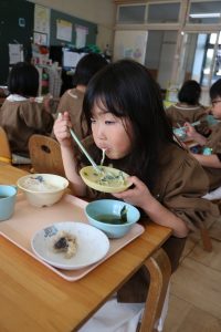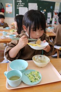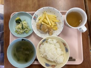 ごはん 魚のかりん揚げ ポテトフライ 中華スープ グリーンサラダ