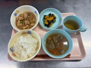 ごはん 豆腐の肉味噌かけ 五目汁 酢の物