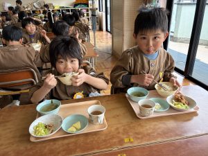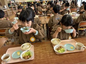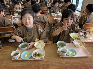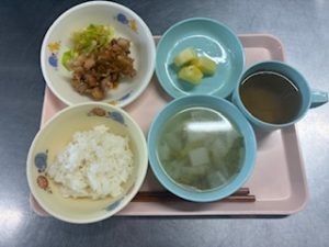 ごはん 油淋鶏 春野菜スープ パイナップル