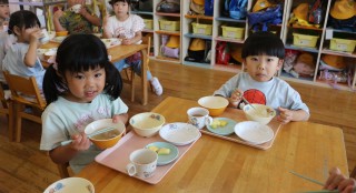 朝の乳児組のおやつ0歳児は月齢にあった赤ちゃんおやつウエハース 牛乳ごはん きしめん汁 肉じゃが みそ和え牛乳 パイン缶...