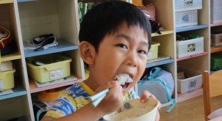 朝の乳児組のおやつ0歳児は月齢にあった赤ちゃんおやつボーロ 牛乳ごはん オニオンスープ 油淋鶏 パイナップル飲むヨーグル...