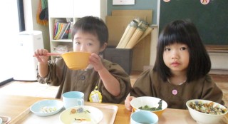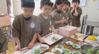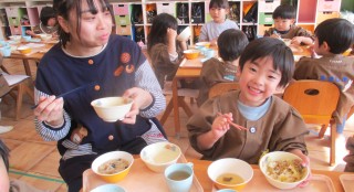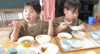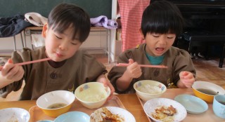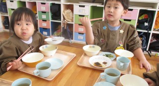 ごはん みそおでん すまし汁 お浸し牛乳 ぜんざい今日の給食風景😊箸を上手に使って食べていますよ 里芋も箸でつかめるよ😊...
