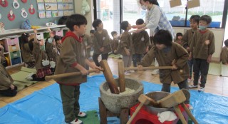 今日はもちつきがありました😊杵や臼を見ると『もちつきだぁ~』と大喜びの子どもたち。もち米が蒸し上がり臼の中に入ると、いよ...