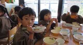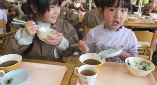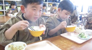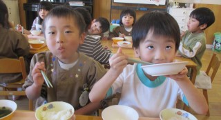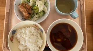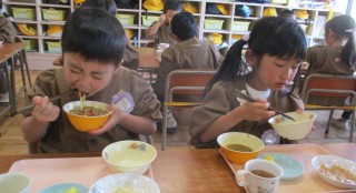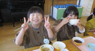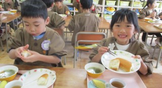 ごはん 回鍋肉 野菜スープ りんご牛乳 豆腐ドーナツいい食べっぷりでいい笑顔😊 年長さんは食べっぷりがいいです😊