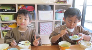 ごはん 卯の花 みそ汁 ごま和え☆水ようかん 牛乳今日の給食風景です😊 おかわりもしてモリモリ食べてます😊