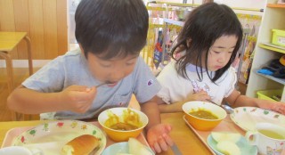 ごはん 白身魚のカレー揚げ オニオンスープ 付け合せフルーツヨーグルト給食の前は手洗いをして・・・洗った後はしっかりタオ...