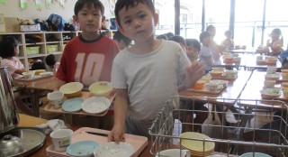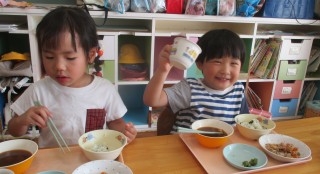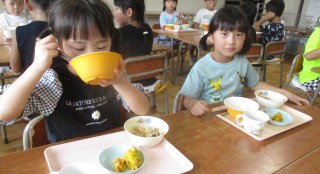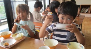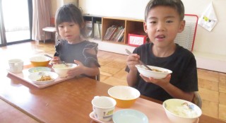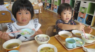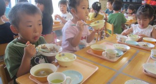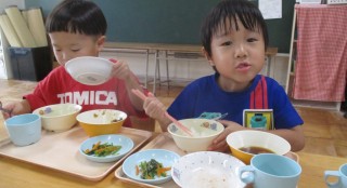 五目おこわ みそ汁 和風サラダフルーツジュレ年長さんは給食前に、献立についての話をみんなで聞きます。今日はおこわについて...