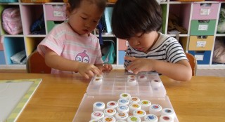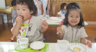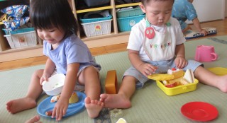 めろんぐみの室内遊びでは、保育者が廃材で電子レンジや机・ソファーなど子どもが楽しめるような物を作り、コーナー...