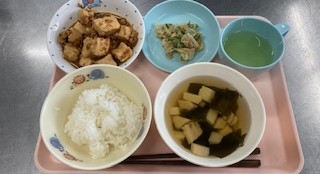 ごはん 肉みそ豆腐 若竹汁 ごまあえ牛乳 きなこドーナツ