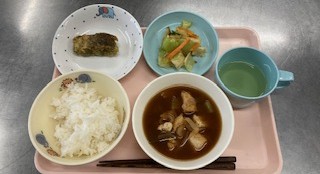 ごはん 鶏肉の揚げ煮 オニオンスープ 中華風あえ牛乳 クラッカー パイン缶