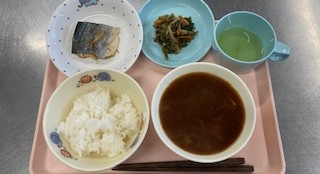 ごはん 煮魚 みそ汁 おかかあえ牛乳 オレンジ ビスケット