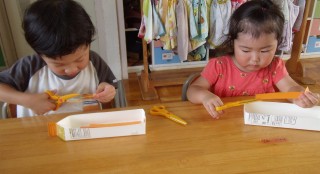 新しくはさみの練習を始めました☺お家で使ったことがある子、初めての子などさまざま。初めてのハサミに、みんな集中して製作し...