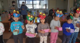 今日は節分の日!!手作りの可愛いお面を付けてみんなで豆まき遊びをしました。大きな声で「おにはーそとー」と言いながら楽しん...