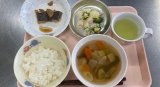 ごはん けんちん汁 煮魚 ポテトサラダ牛乳 ビスケット