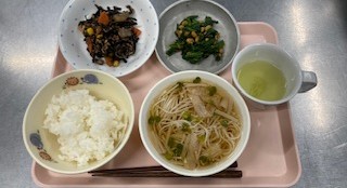 ごはん そうめん汁 ひじきの炒め煮 納豆和え牛乳 いちごの蒸しパン