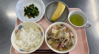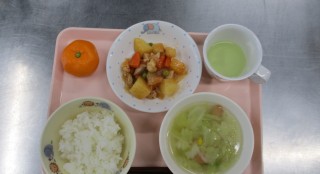 ごはん 鶏肉のケチャップ煮 キャベツスープ みかんばなな クラッカー 野菜ジュース