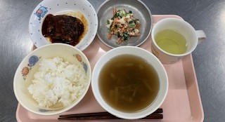ごはん 豆腐とひじきのハンバーグ 付け合せ 野菜スープヨーグルト 塩せんべい