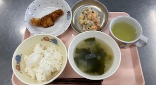 ごはん 白身魚の揚げ煮 わかめスープ ポテトサラダ牛乳 ケーキ