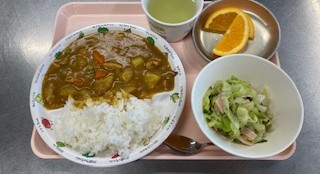 チキンカレー フレンチサラダ オレンジ牛乳 ビスケット