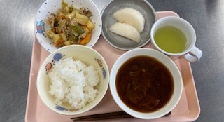 ごはん みそ汁 じゃが玉のカレー炒め なし牛乳 ポテトスナック