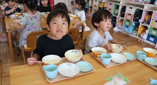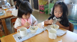 朝の乳児組のおやつ0歳児は月齢にあった赤ちゃんおやつウエハース 牛乳ごはん きしめん汁 肉じゃが みそ和え牛乳 パイン缶...