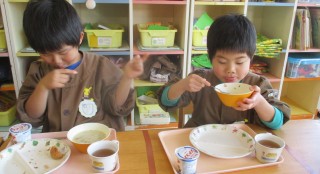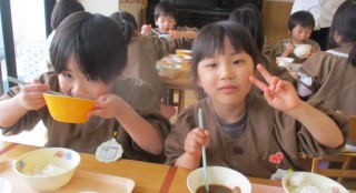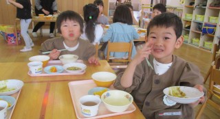 ごはん みそおでん すまし汁 ごまあえ牛乳 ジャムサンド今日の給食風景😊今日はきりんぐみ・ぞうぐみさん合同で給食を食べま...