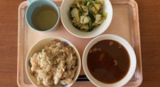 五目おこわ みそ汁 白あえ ばなな飲むヨーグルト せんべい今日の給食風景😊 みんなで楽しくおしゃべりしながら食べる給...