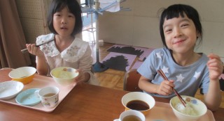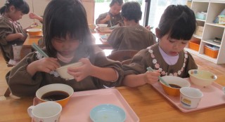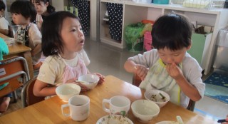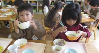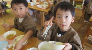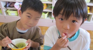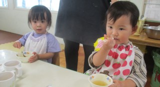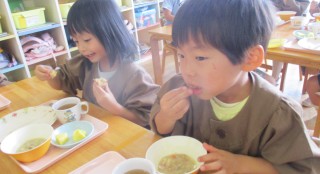 ちらし寿司 すまし汁 りんごケーキ 牛乳 アレルギーの子用のケーキ今日はちらし寿司😆 みんなモリモリ食べていますね😊...