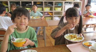 ごはん 豚肉と玉葱のカレー炒め チンゲンサイスープ 柿牛乳 パイン缶 ポテトスナック今日の給食風景😆 おいしそうにパクパ...