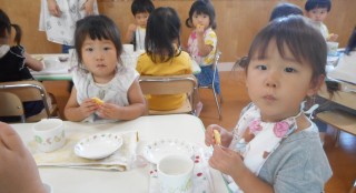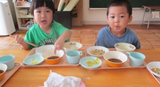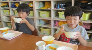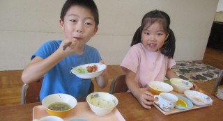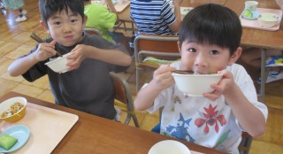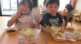 枝豆ごはんの夏野菜カレー コーンサラダ メロンクッキー 牛乳おやつの前には手洗いをして・・・😊食事の前のご挨拶も元気よく...