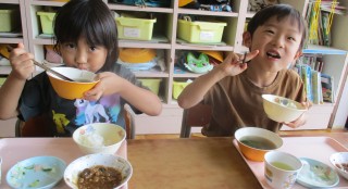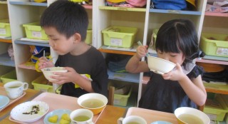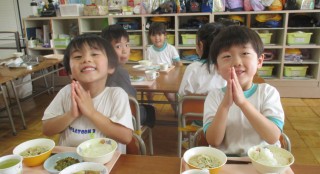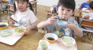 ごはん 肉じゃが きしめん汁 みそあえ野菜ジュース チーズ せんべい食事前のご挨拶もしっかり出来ている子どもたち😊今日は...