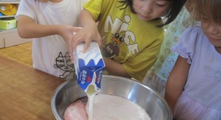 ごはん 白身魚の磯辺揚げ 五目汁 付け合せフルーチェフルーチェに興味津々の子どもたちこぼれないように、そーっと今日のお...