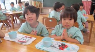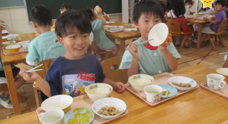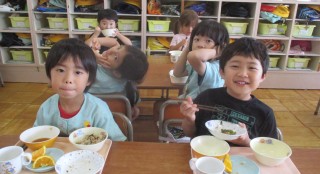 ひじきごはん みそ汁 おかかあえ オレンジ野菜ジュース せんべいみんなとってもおいしそうに食べていますね😊