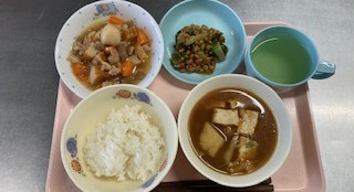 ごはん はんぺんのくず煮 五目煮 切干大根の納豆あえ牛乳 リエム